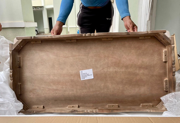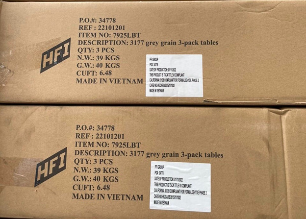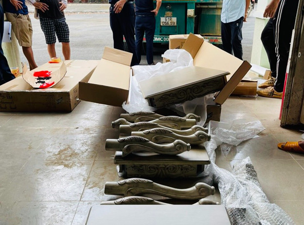 Đặc biệt, cơ quan hải quan phát hiện trong lô hàng có 40 thùng chứa bàn gỗ, mới 100%. Chi tiết này hoàn toàn không có trong tờ khai, toàn bộ là chân ghế sofa bằng gỗ cao su đã được sơn phủ. Mỗi thùng có 2 chiếc bàn lớn và 2 bàn nhỏ có chân ghế tháo rời, bên ngoài thùng carton và ngay bên dưới thân bàn gỗ mới này đều thể hiện “Made in Vietnam”.