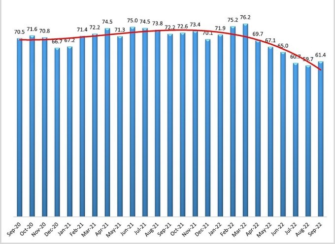 Các chỉ số logistics lần đầu ghi nhận mức tăng trưởng vào tháng 9, sau đà giảm liên lục từ tháng 4. Theo đó, chỉ số LMI trong tháng 9 đạt 61,4 điểm, tăng 1,7 điểm so với tháng 8 nhưng thấp hơn mức kỷ lục hồi tháng 3 gần 15 điểm.