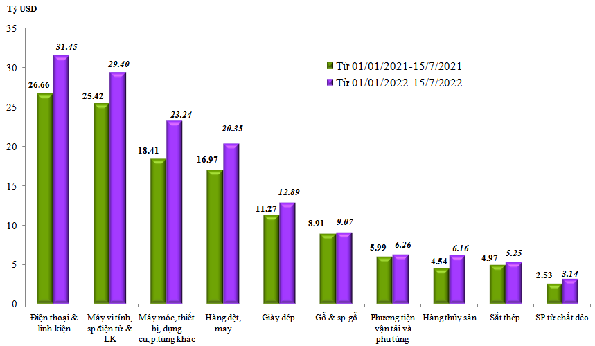 Trị giá xuất khẩu kỳ 1 tháng 7/2022 giảm so với kỳ 2 tháng 6/2022 ở một số nhóm hàng sau: máy vi tính, sản phẩm điện tử & linh kiện giảm 1,41 tỷ USD, tương ứng giảm 45,9%; điện thoại các loại và linh kiện giảm 682 triệu USD, tương ứng giảm 26,8%; máy móc, thiết bị, dụng cụ & phụ tùng khác giảm 274 triệu USD, tương ứng giảm 13%; sắt thép các loại giảm 193 triệu USD, tương ứng giảm 44%…