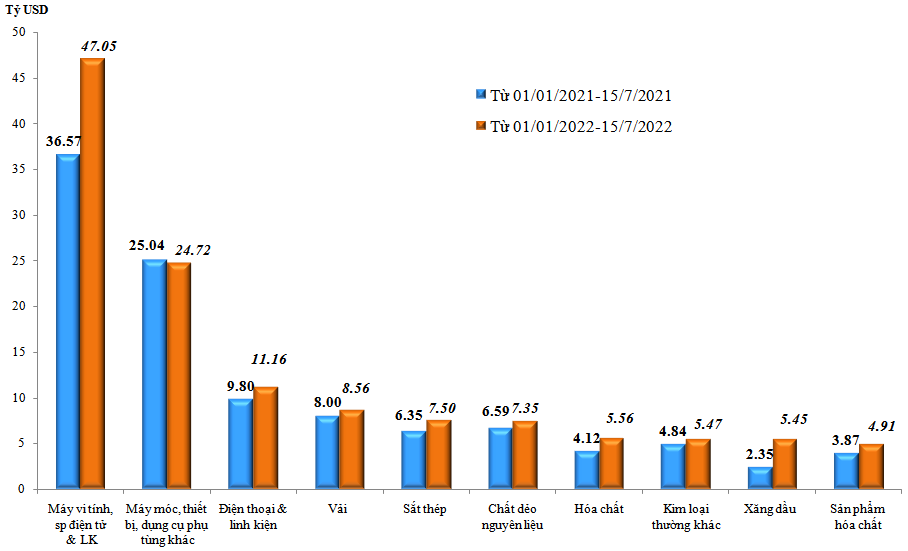 Trị giá nhập khẩu hàng hóa trong kỳ 1 tháng 7/2022 tăng so với kỳ 2 tháng 6/2022 chủ yếu ở một số nhóm hàng sau: máy vi tính sản phẩm điện tử và linh kiện tăng 465 triệu USD, tương ứng tăng 13,8%; điện thoại các loại & linh kiện tăng 164 triệu USD, tương ứng tăng 23,9%…