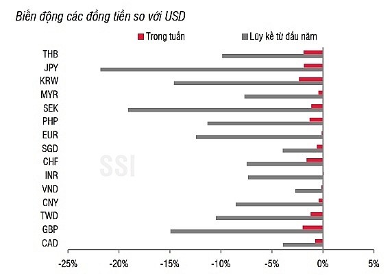 Hiện chỉ số USD Index (DXY) đo lường biến động đồng bạc xanh đã tăng mạnh lên mức 109,64 điểm, mức cao nhất trong 20 năm qua. Trong khi đó, một số đồng tiền chủ chốt đều giảm giá so với USD như đồng Bảng Anh (GBP) -2,0%, Yên Nhật -1,86%, Euro -0,1%. Các đồng tiền trong khu vực châu Á cũng ghi nhận mức giảm mạnh như Won Hàn Quốc -2,3%, Baht Thái Lan -1.90%, Đài tệ Đài Loan -1,2%,…