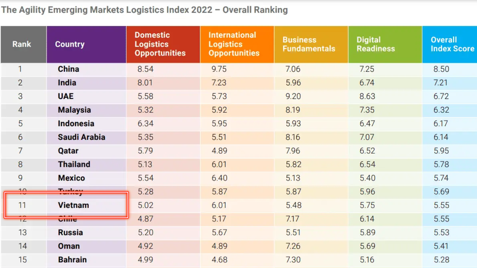 Nhà cung cấp dịch vụ vận tải và hậu cần kho vận Agility mới công bố danh sách 50 thị trường logistics mới nổi hấp dẫn nhất thế giới. Trong đó, Việt Nam xếp hạng 11 trên tổng số 50 thị trường logistics mới nổi.